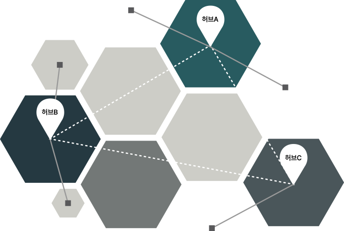 차로 1시간 이내에 도달할 수 있게 구역을 나누고 지역거점 허브를 설립해 운영합니다